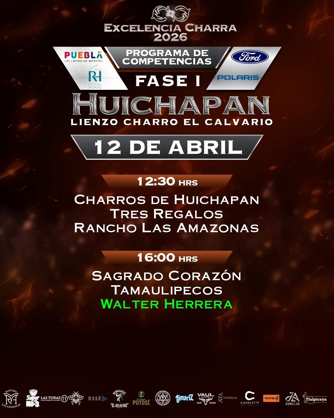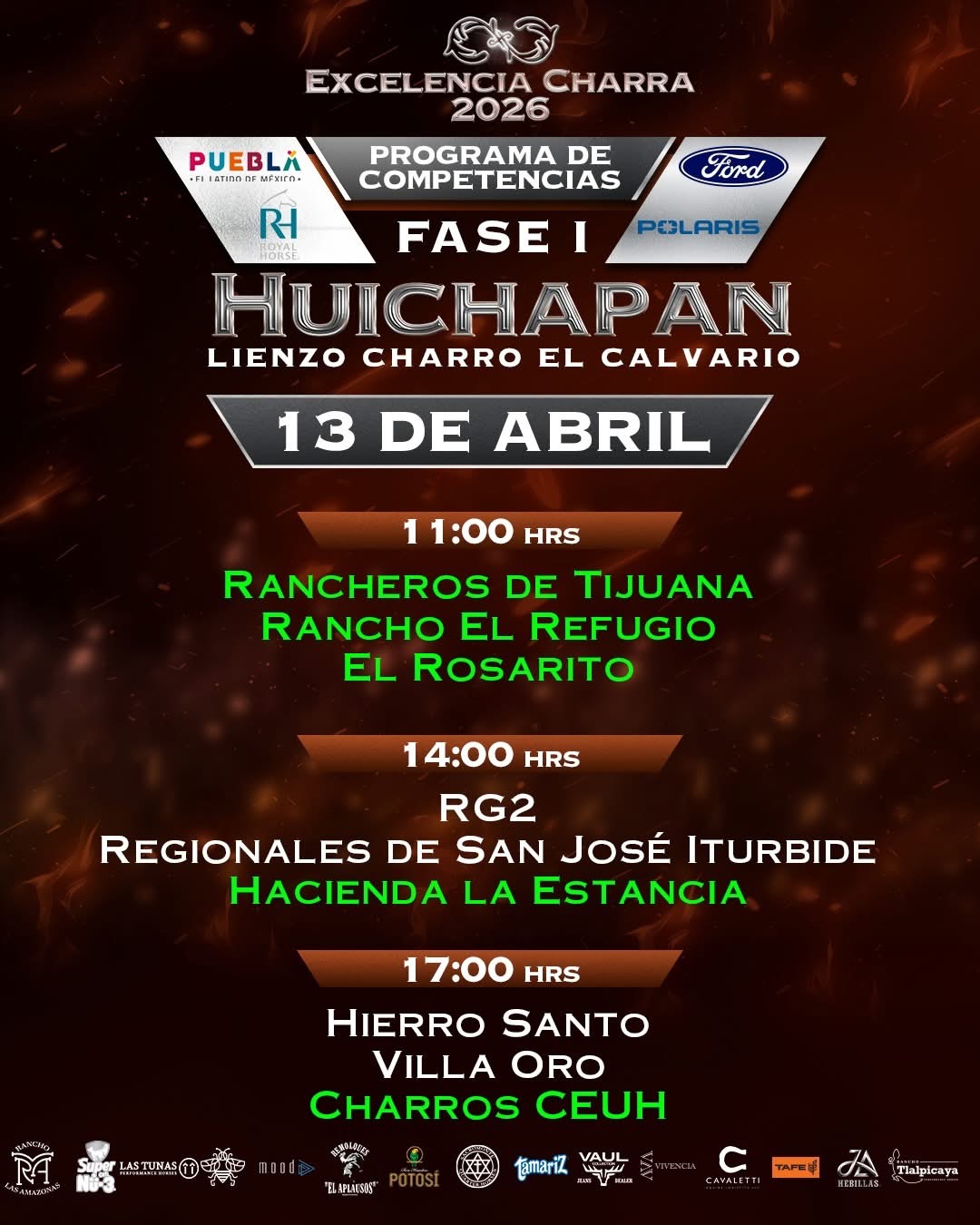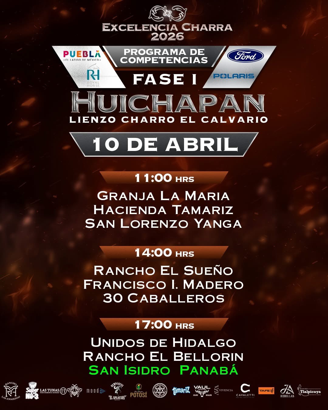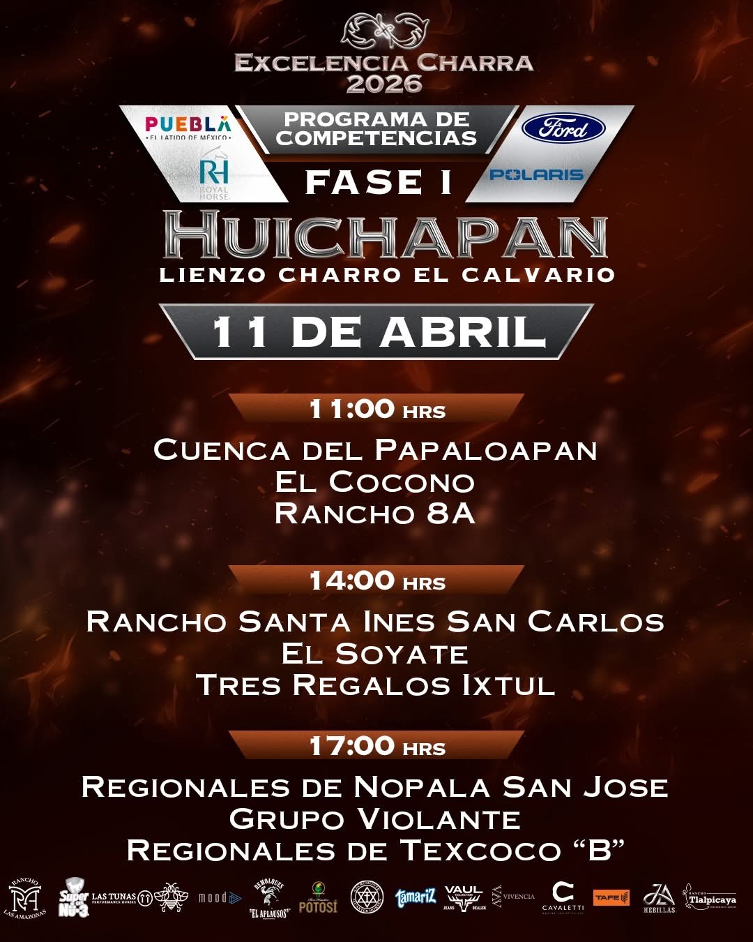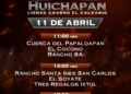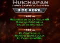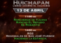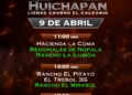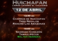 Una emocionante jornada sabatina se disputará el 11 de abril en las instalaciones del lienzo «El Calvario» de Huichapan, con la participación, de la Cuenca del Papaloapan, Rancho El Cócono y Rancho 8A, en la charreada de las 11:00 horas; posteriormente, a las 14:00 horas, Rancho Santa Inés «San Carlos», el monarca nacional El Soyate de Zacatecas y los aguerridos Tres Regalos «Ixtul». A las 17:00 horas, en el duelo vespertino, medirán fuerzas los Regionales de Nopala «San José», Grupo Violante y los Regionales de Texcoco «B».