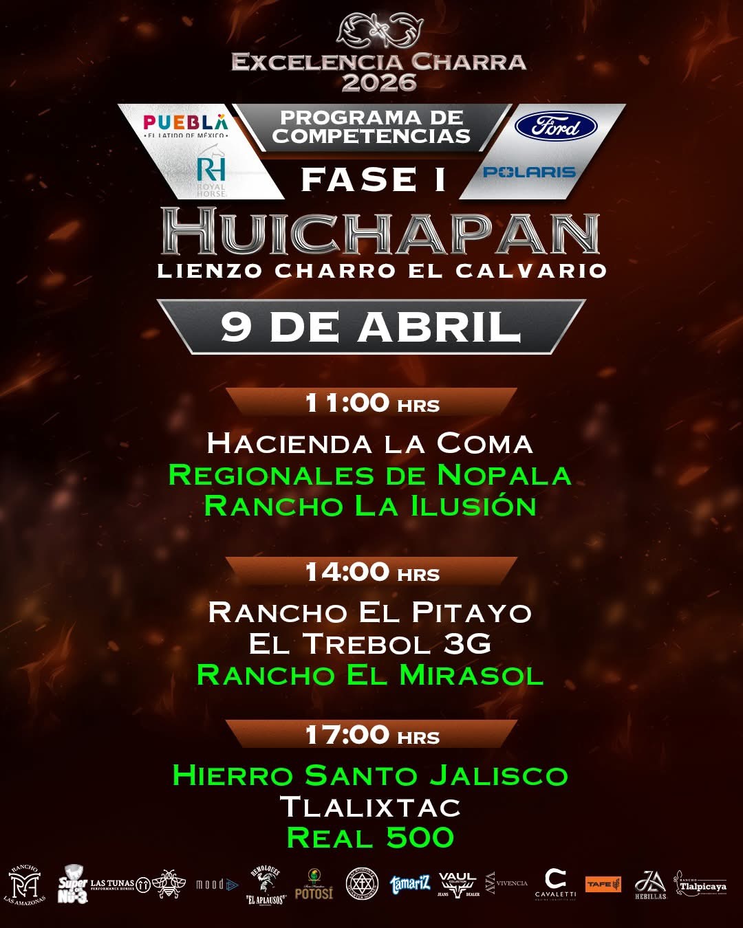 Las siguientes tres competencias se disputarán el jueves 9 de abril a partir de las 11:00 horas con la presentación de Hacienda Las Coma, Regionales de Nopala y Rancho La Ilusión; después, a las 14:00 horas, medirán fuerzas Rancho El Pitayo, El Trébol 3G y Rancho El Mirasol, y la vespertina la disputarán, desde las 17:00 horas, Hierro Santo de Jalisco, Tlalixtac de Oaxaca y Real 500 de Puebla.