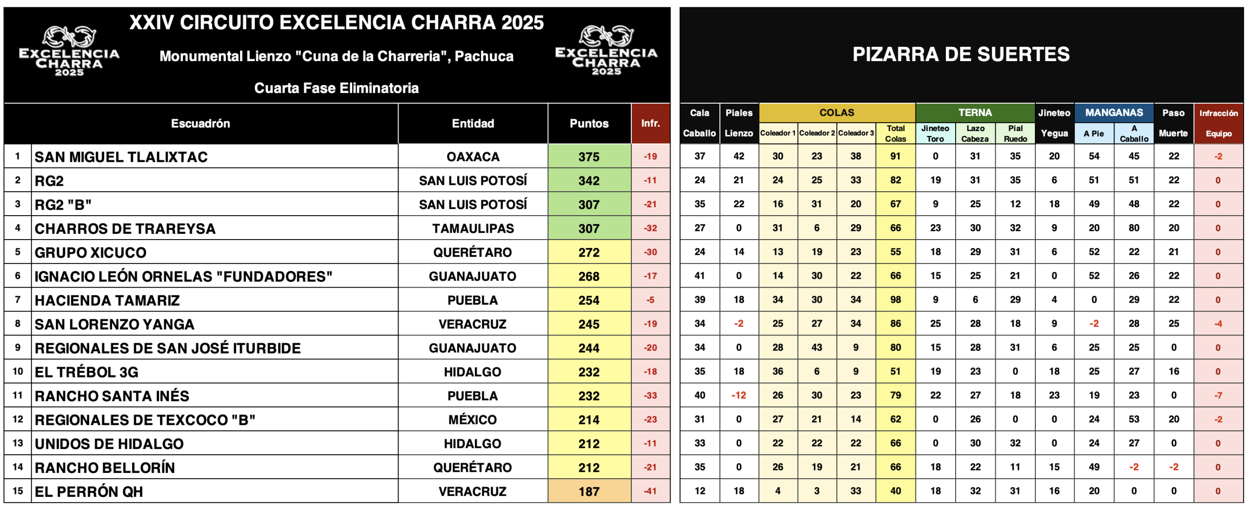 La cuarta fase eliminatoria del Circuito Excelencia Charra 2025 continuó este viernes 5 de septiembre en el Monumental Lienzo “Cuna de la Charrería” de Pachuca, con dos competencias que mantuvieron el interés del público y la emoción del campeonato.
