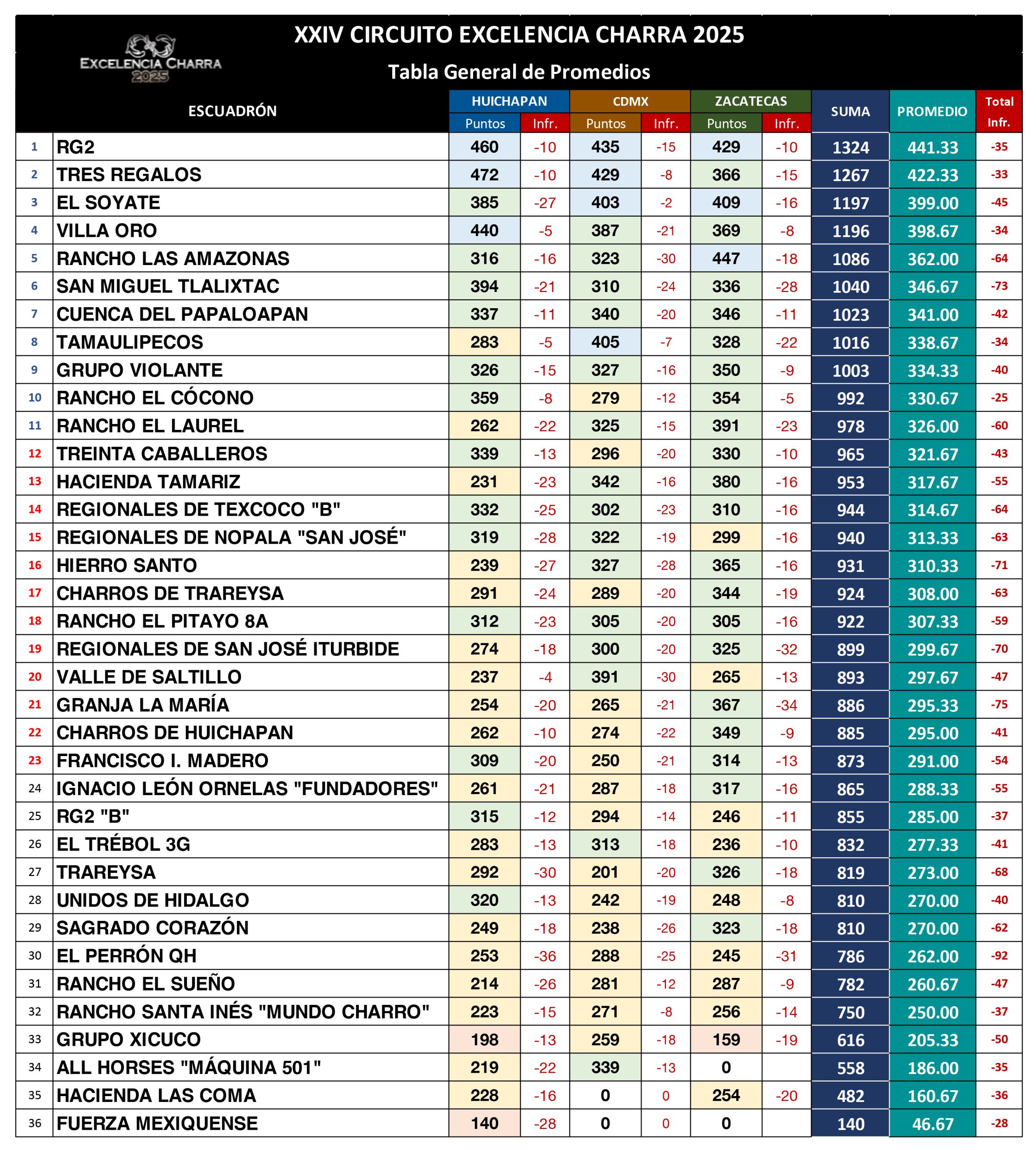 Le siguen Tres Regalos con 422.33 unidades, El Soyate con 399.00, Villa Oro con 398.67 y Rancho Las Amazonas con 362.00. Estas escuadras llegan a Pachuca como favoritas, aunque nada está escrito en un circuito tan competitivo, donde participan 36 escuadras de mucho nivel.
