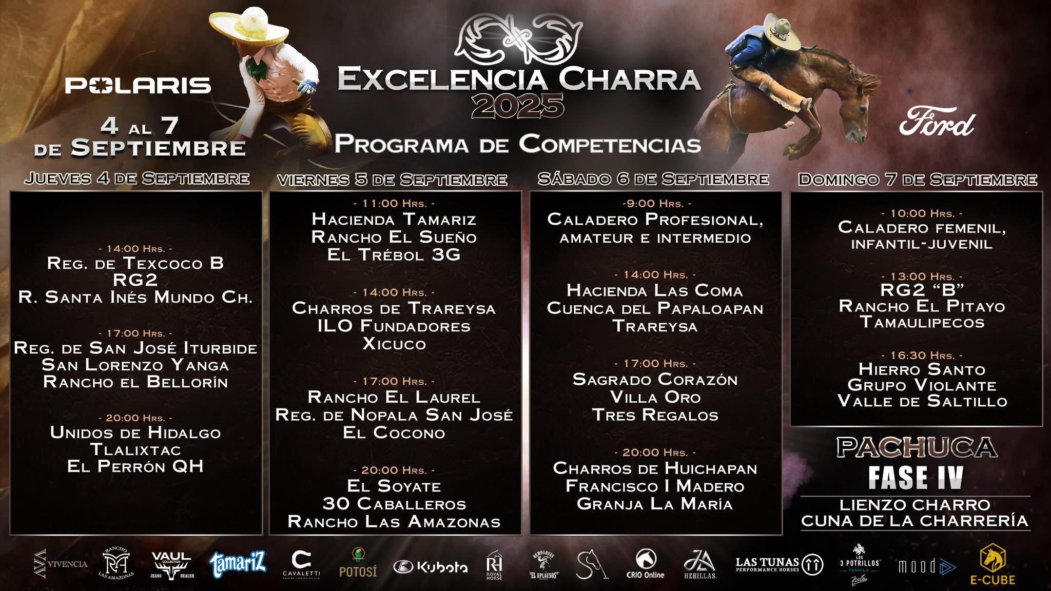 El programa de competencias iniciará el jueves 4 de septiembre con tres charreadas: a las 14:00 horas entran Regionales de Texcoco “B”, RG2 y Rancho Santa Inés «Mundo Charro»; a las 17:00 horas competirán Regionales de San José Iturbide, San Lorenzo Yanga y Rancho Bellorín; cerrando a las 20:00 horas con Unidos de Hidalgo, Tlalixtac y El Perrón QH.