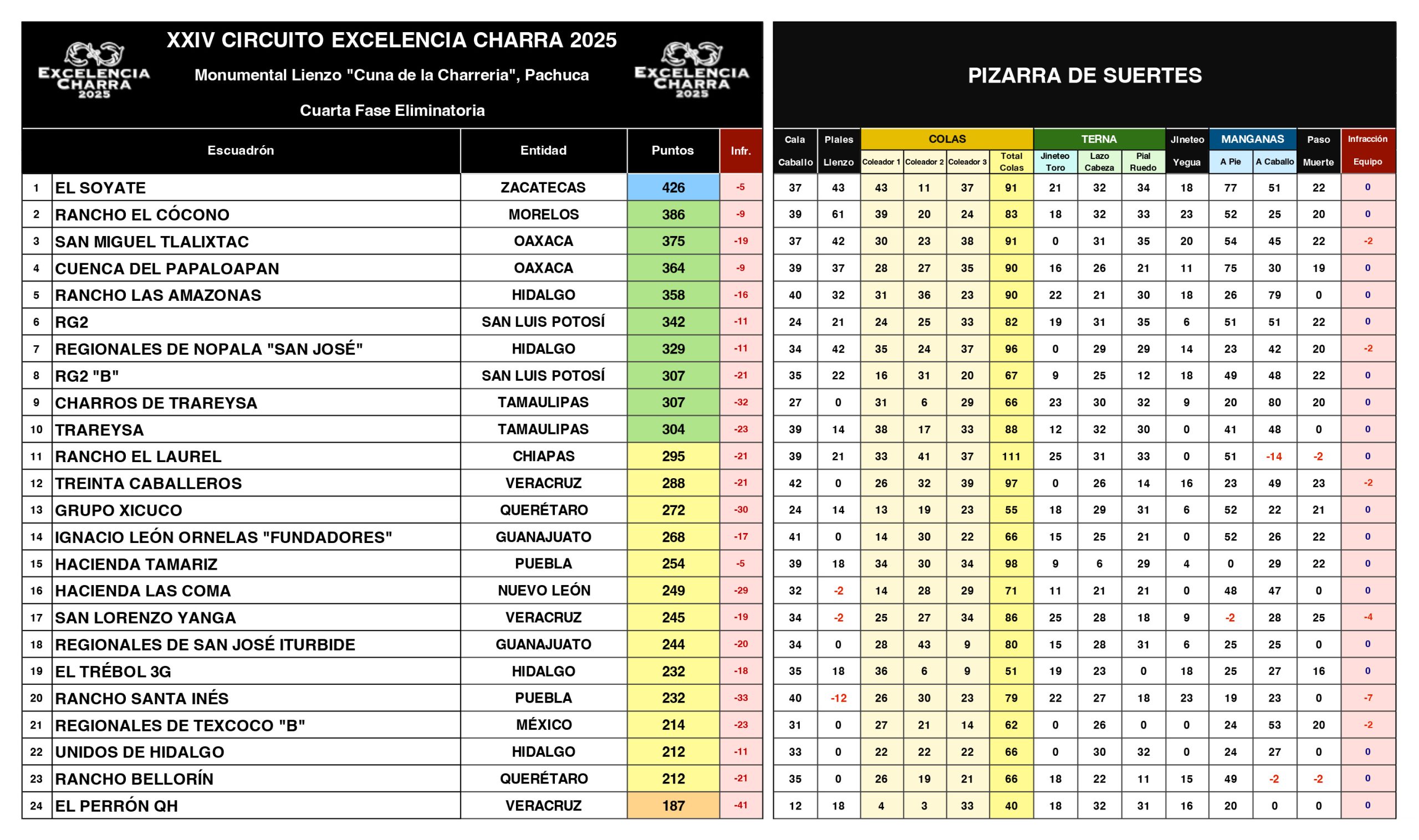 Las emociones del Circuito Excelencia Charra, también conocido como “El Torneo de los Campeones”, continúa en su cuarta y última fase eliminatoria en el Monumental Lienzo de Pachuca, continúa las actividades de equipos, caladeros y coleadero, en las jornadas de sábado y domingo, justo antes de definir a los invitados que clasificarán directamente a las semifinales, así como aquellos escuadrones que disputarán la etapa de Repechaje.