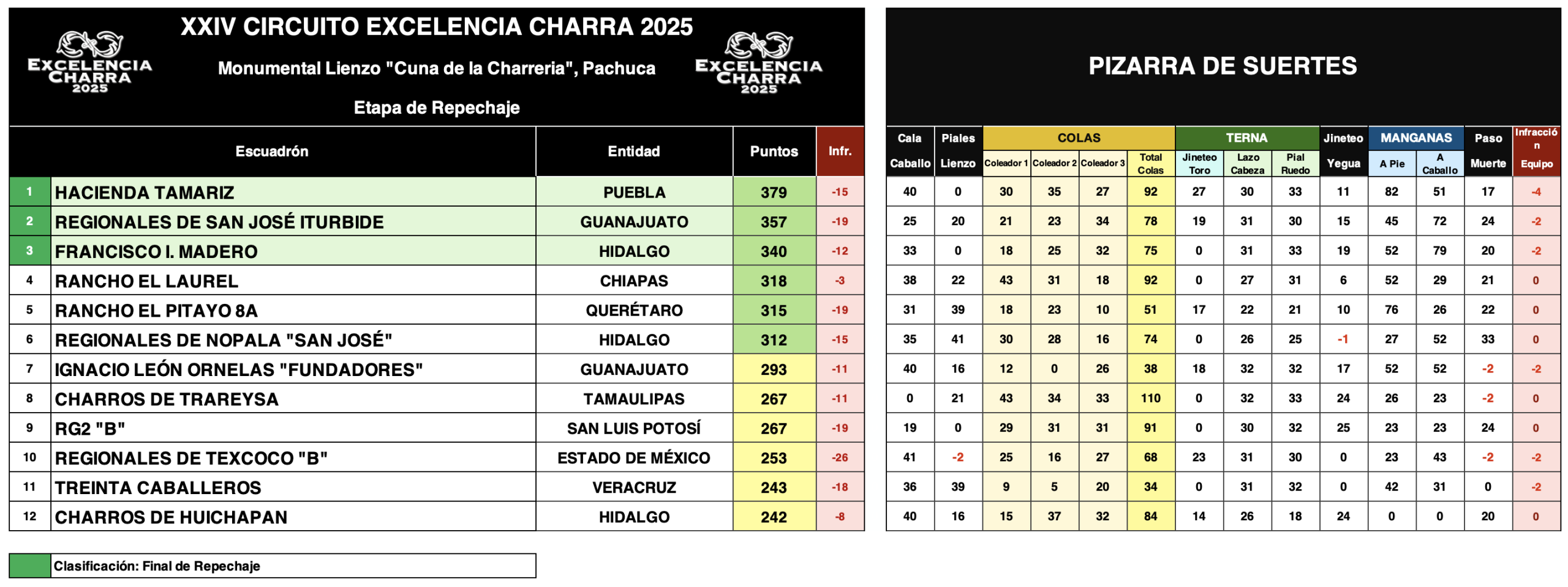 Con dos vibrantes charreadas concluyó este martes la etapa de Repechaje del circuito Excelencia Charra 2025, en el Monumental Lienzo «Cuna de la Charrería» de Pachuca, dejando todo listo para la esperada Final de Repechaje que otorgará el último boleto a los cuartos de final.