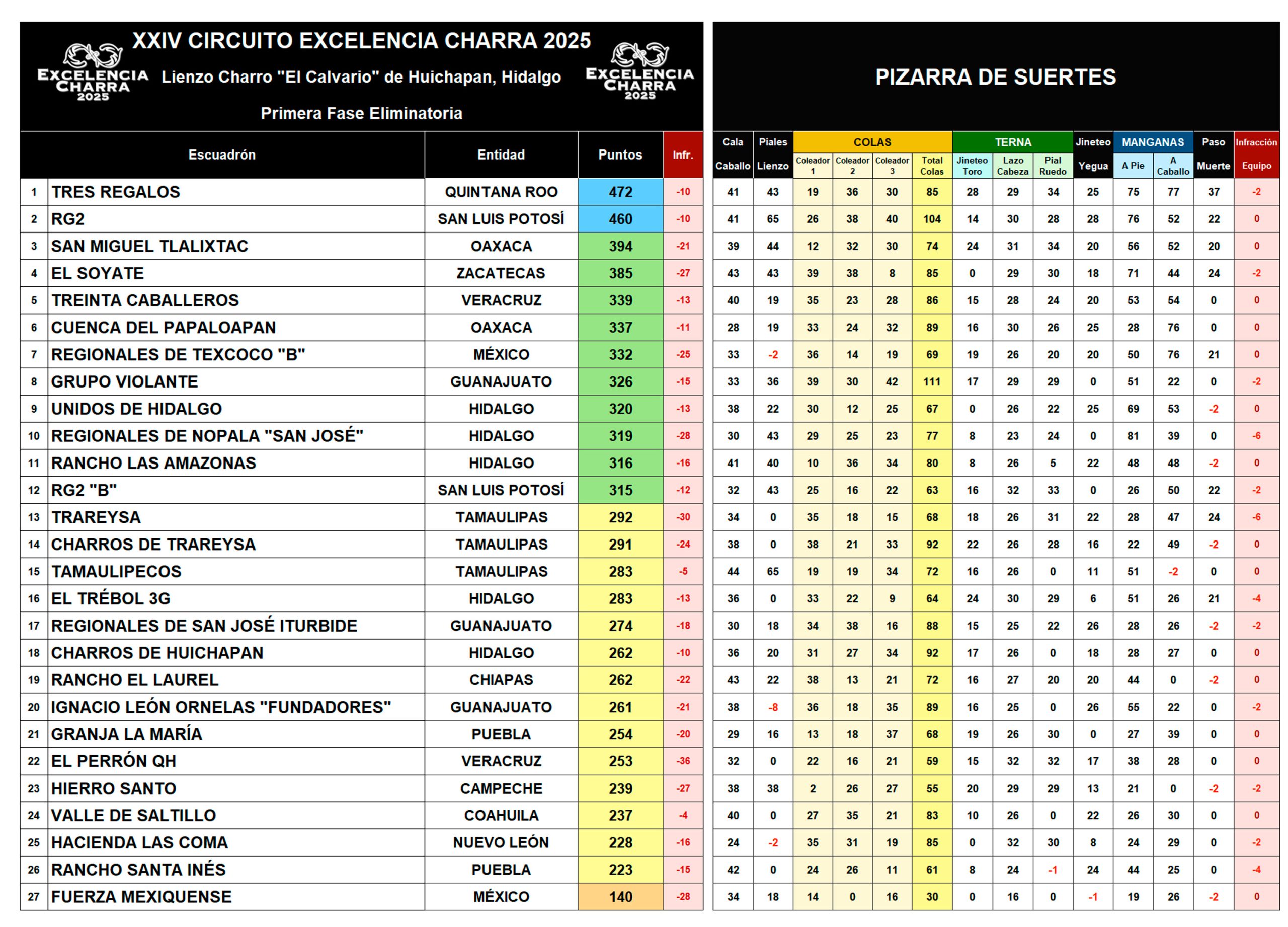 De esta forma, los Tres Regalos se convierten en nuevos líderes del Circuito Excelencia Charra 2025 con la friolera de 472 unidades, seguidos por el elenco potosino RG2 con 460 buenos, y Tlalixtac de Oaxaca desciende a tercer escalón con 394 puntos.