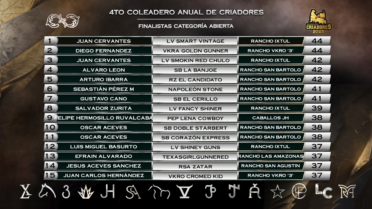 <hr /> <h4 style="text-align: center;"><strong>IV Coleadero de Criadores 2025</strong> <strong>Resultados</strong></h4> <img class="aligncenter size-full wp-image-24283" src="https://excelenciacharra.com/wp-content/uploads/2025/09/1-SF-ABIERTO-Coleadero-de-Criadores-EXCH-.jpeg" alt="" width="1280" height="720" /> <img class="aligncenter size-full wp-image-24285" src="https://excelenciacharra.com/wp-content/uploads/2025/09/3-FUTURITY-Coleadero-de-Criadores-EXCH-.jpeg" alt="" width="1280" height="720" /> <img class="aligncenter size-full wp-image-24284" src="https://excelenciacharra.com/wp-content/uploads/2025/09/2-DERBY-Coleadero-de-Criadores-EXCH-2025.jpeg" alt="" width="1280" height="720" /> <img class="aligncenter size-full wp-image-24286" src="https://excelenciacharra.com/wp-content/uploads/2025/09/4-AMATEUR-Coleadero-de-Criadores-EXCH-.jpeg" alt="" width="1280" height="720" /> <img class="aligncenter size-full wp-image-24287" src="https://excelenciacharra.com/wp-content/uploads/2025/09/5-MAYORES-Coleadero-de-Criadores-EXCH-.jpeg" alt="" width="1280" height="720" /> <hr />